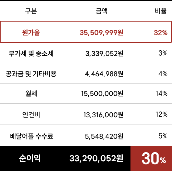 인건비 최소화 & 낮은 원가율(32%)